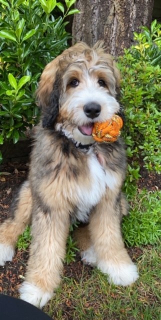 Reagan (Formerly Pete) We found Janet through an online search for Bernedoodle breeders in the Pacific Northwest. She was very easy to work with, and you can tell she is fully invested in the well-being of her pups. Our girl, Reagan, is 7 months old now, and she is the major source of laughter and entertainment in our household. We have two kids under the age of 8, and she is so great with them. She is definitely higher energy than our previous dog (a pure-bred Bernese Mountain dog), but not overwhelmingly energetic. Her coat is beautiful, and so far, SHED-FREE which has been amazing. I would absolutely recommend Janet to others looking for a bernedoodle pup.